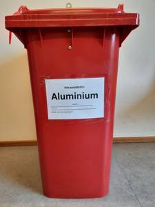 Informationen zur Alusammlung sind an der Tonne angebracht